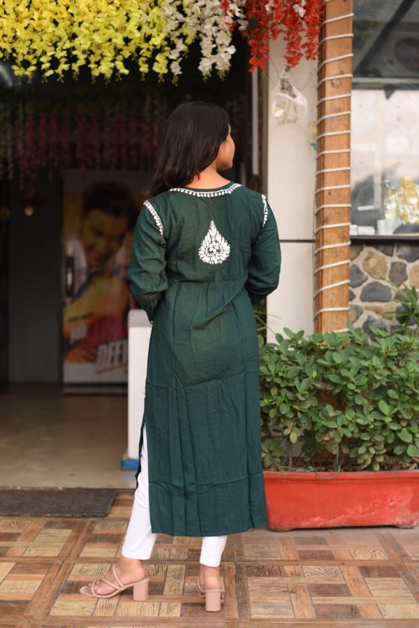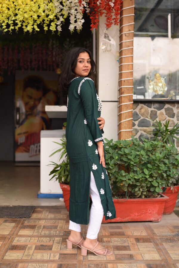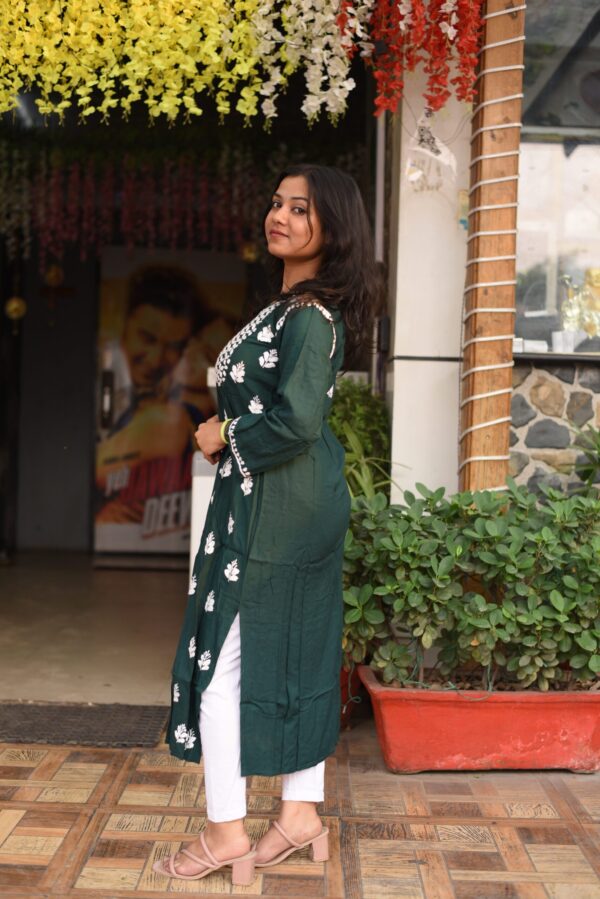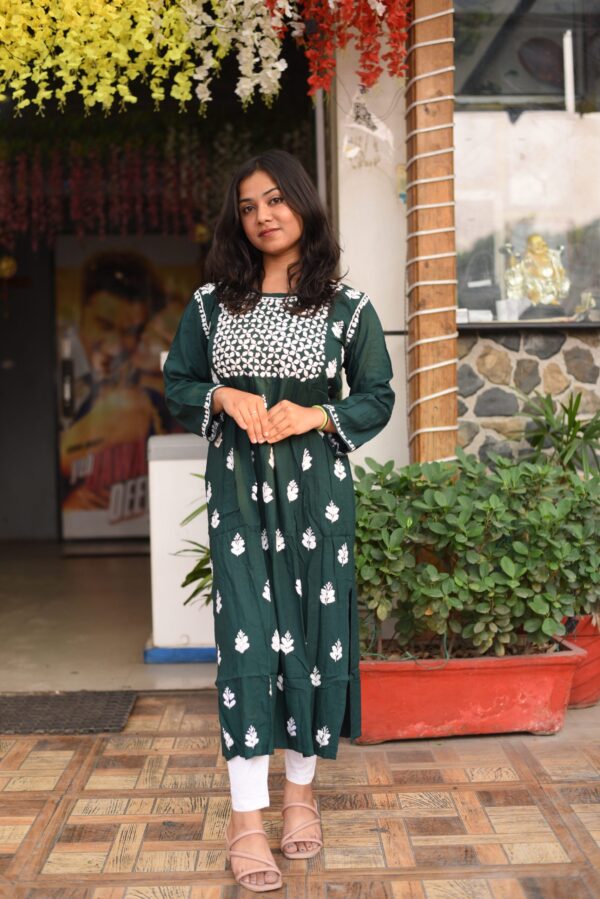Green Chikankari Cotton Kurti with White Thread Work. This exquisite piece perfectly balances traditional artistry and modern design, making it a versatile addition to your ethnic collection.