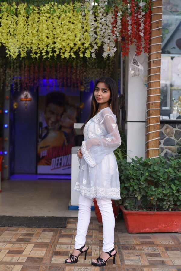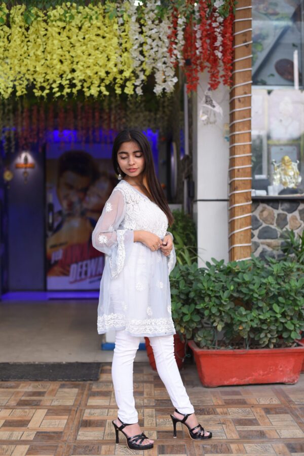 Elevate your ethnic wardrobe with this elegant Grey Chikankari Short Frock Kurti, a perfect blend of tradition and contemporary style. Crafted from premium quality fabric, this kurti features intricate Chikankari embroidery, showcasing the timeless art form from Lucknow. The soft grey hue adds a touch of subtle sophistication, making it an ideal choice for both casual and festive occasions.