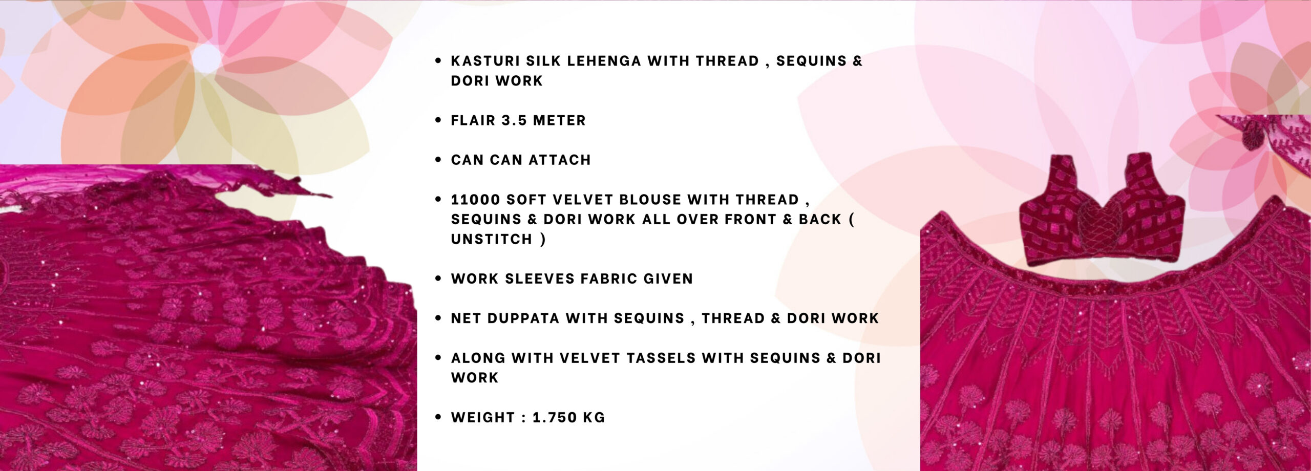 Turn heads in this gorgeous Kasturi silk lehenga with intricate thread, sequins, and dori work—paired with a luxurious velvet blouse and net dupatta.