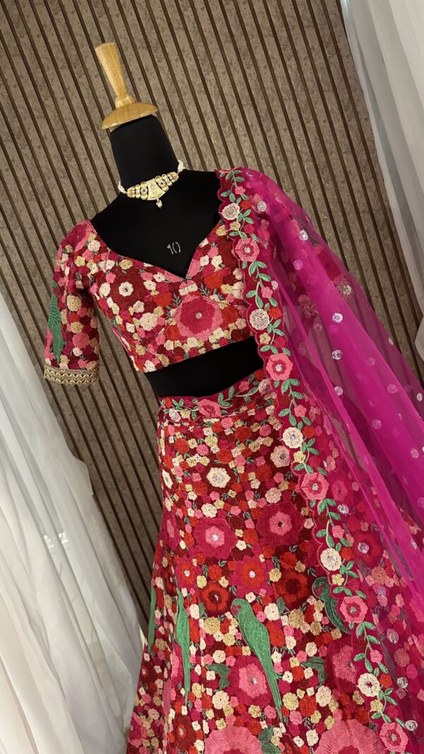 Tapeta velvet lehenga adorned with intricate chainstitch embroidery and shimmering sequins. With a generous 4-meter flair and the option to attach a can can, this ensemble promises a regal twirl with every step.