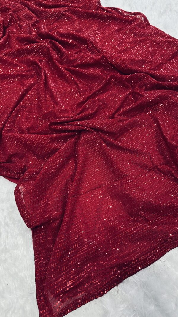 Shine bright with the Lustrous Elegance Red Sequin Saree! Made from luxurious Georgette with intricate sequin work and a Banglori silk blouse, this saree is perfect for weddings, parties, and festive occasions. Shop Now.