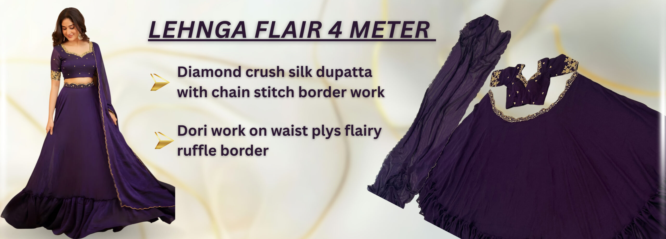 Royal Purple Party Wear Lehenga crafted in premium Diamond Crush Silk with elegant sequins, thread & dori work. Designed with a rich 4 meter flare and stylish ruffle border, paired with an unstitched blouse and matching dupatta. A perfect choice for weddings, engagements, receptions and festive occasions.