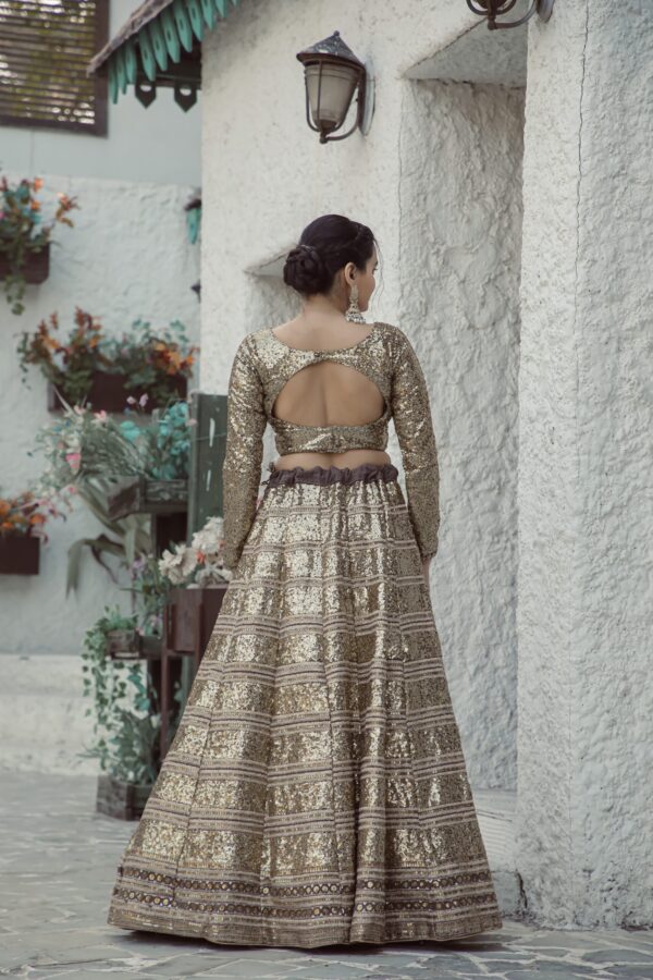 Dive into the world of sheer opulence with our Faux Georgette Lehnga set. Immerse yourself in the allure of heavy sequins, zari, and dori work meticulously crafted onto the fabric