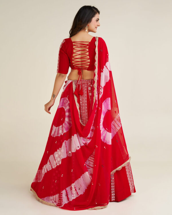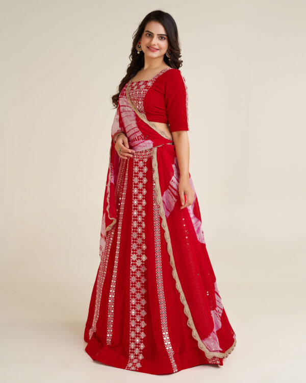 Shop the Ruby Glow Mirror Work Lehenga Choli, featuring a faux georgette lehenga with 3.5-meter flair, thread and sequin work, and a stunning digital print dupatta