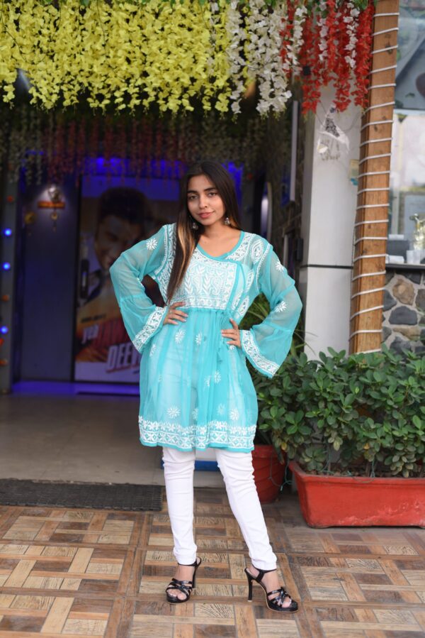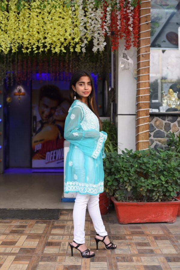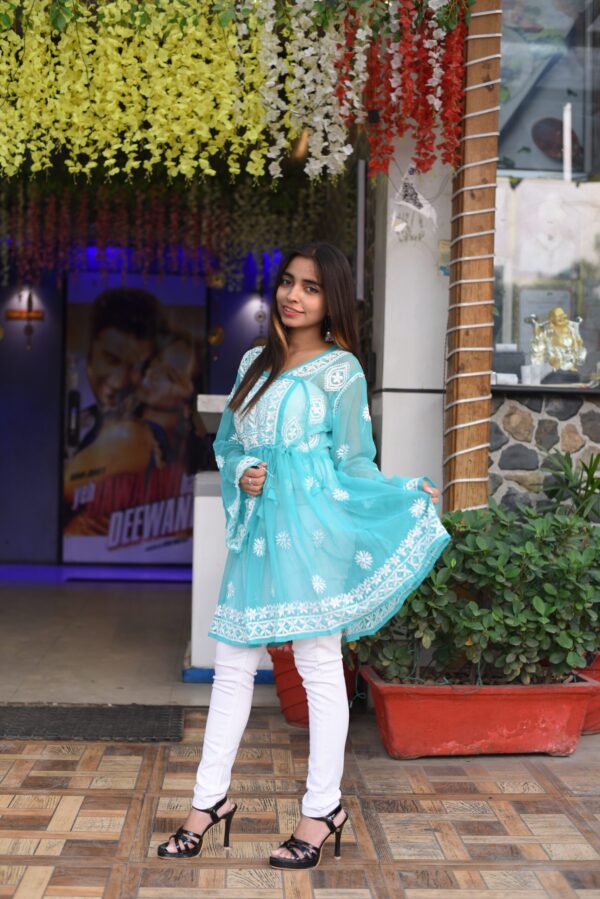 Embrace the elegance of tradition with this exquisite sky blue designer chikankari kurti. Combining timeless craftsmanship with contemporary design, this kurti is perfect for those who seek both style and comfort.