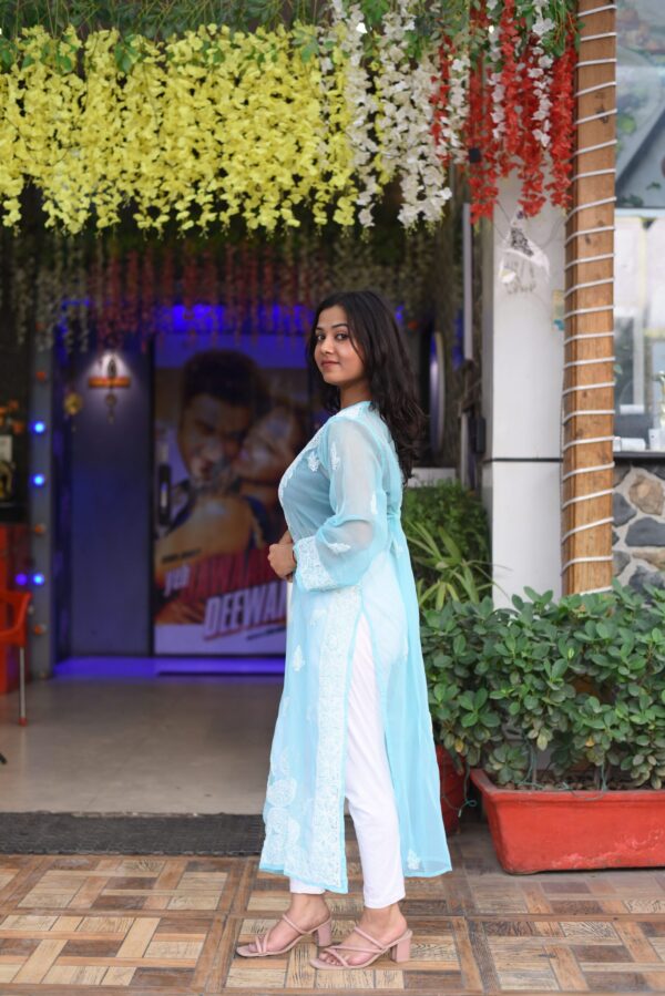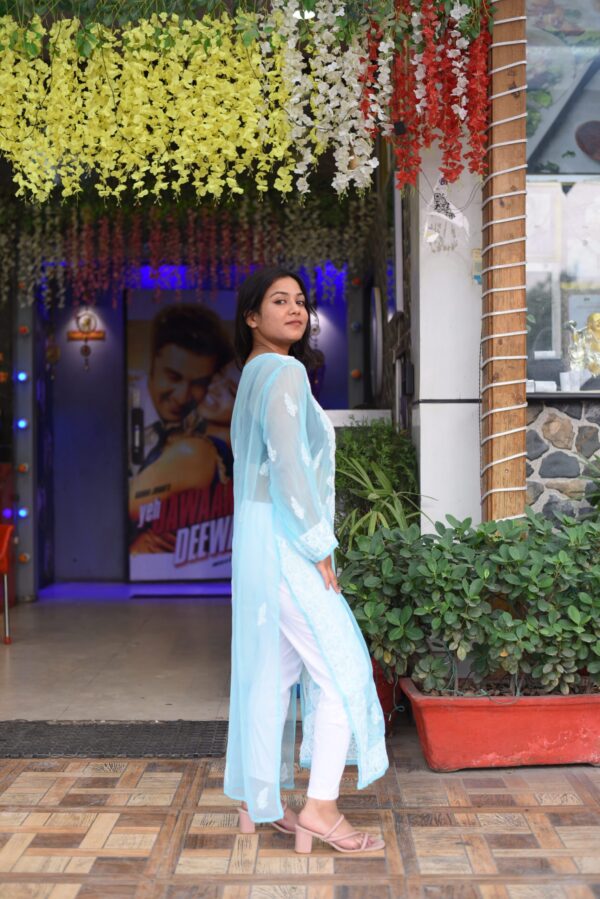 Elevate your style with our Skyblue Partywear Chikankari Kurti. Hand-embroidered elegance perfect for any occasion. Soft fabric, hand wash recommended.