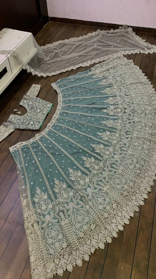 Indian lehenga set featuring net lehenga, sequin and Dori work, can-can attachment, unstitched blouse, and a matching dupatta for the perfect seasonal celebration.
